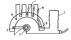1-调温旋钮;2-金属滑动片;3-断电点;4-接线柱(也是金属滑动片接触点);5-中点接线柱;6-附加电阻;7-电炉丝;8-接触点。