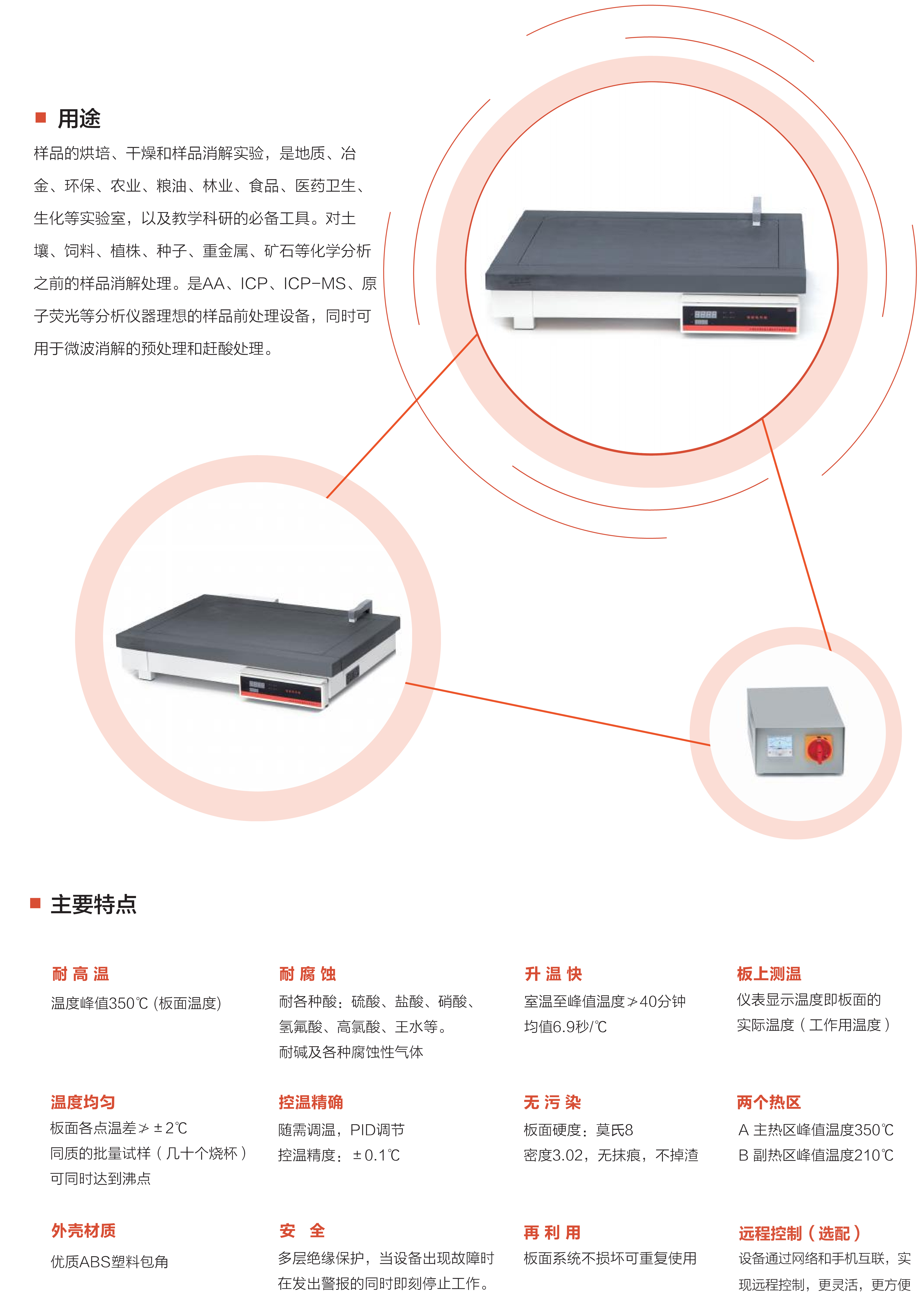 The products are widely used for Sample baking, drying and sample digestion test, is a necessary tool for geological, metallurgical, environmental protection, agriculture, grain and cooking oil, forestry, food, medical and health, biochemical and other laboratories, as well as teaching and research. Sample digestion before chemical analysis of soil, feed, plants, seeds, heavy metals, ore. It is an ideal equipment of sample pretreatment for analytical instruments such as AA, ICP, ICP-MS, and atomic fluorescence. It can also be used for pretreatment and acid removal treatment of microwave digestion.